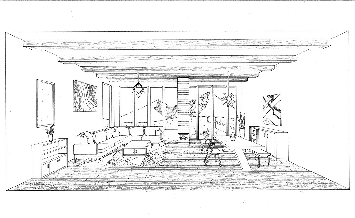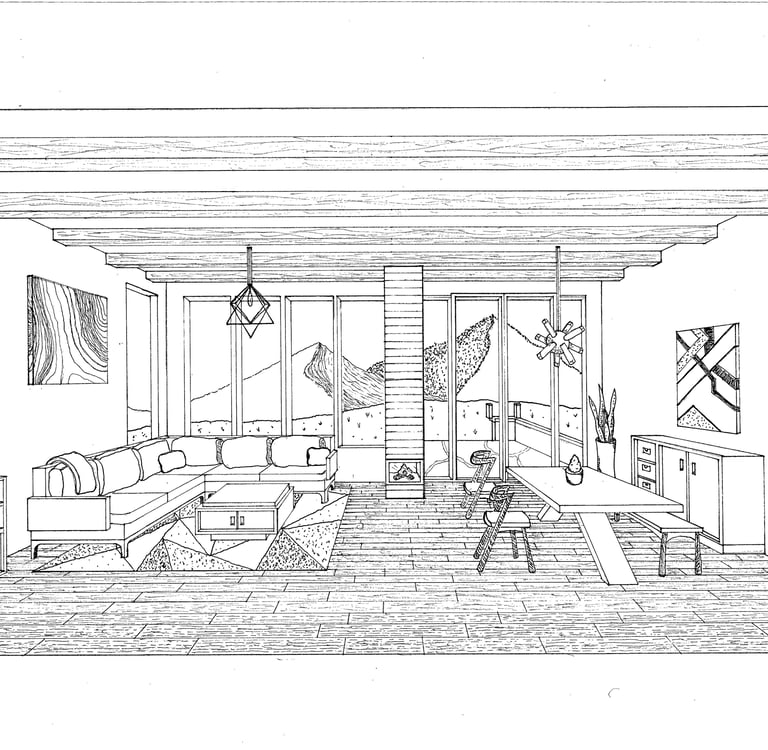 This is a hand drafted living and dining in a fictional location. The goal of this assignment was to capture the depth and layout of a space while offering ques to the type of design through detail and illustration.