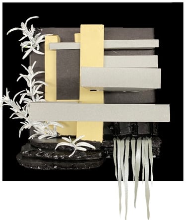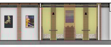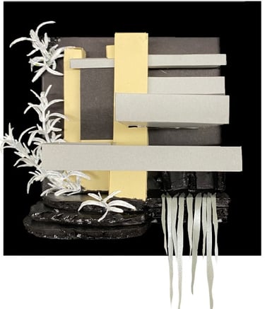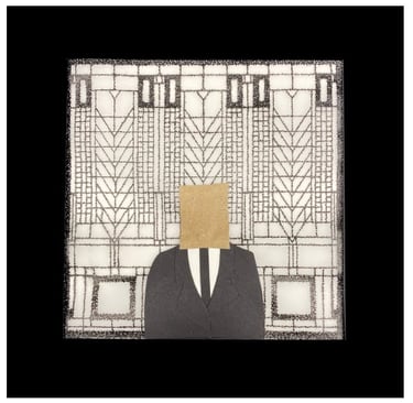 Frank Lloyd Wright was an American born architect who broke architectural norms throughout his career. The first frame is a depiction of one of Wrights most well-known buildings, Falling Water. The frame in the middle resembles Wrights Tree of Life, stained glass window. Wright appears in front of the window with a bag over his head to resemble the life events that most people don’t know or haven’t paid attention to because his career outshined them. The last frame is a model of Side Chair. A commissioned piece designed for a house in Illinois and represents the becoming’s of Wrights Prairie School style.